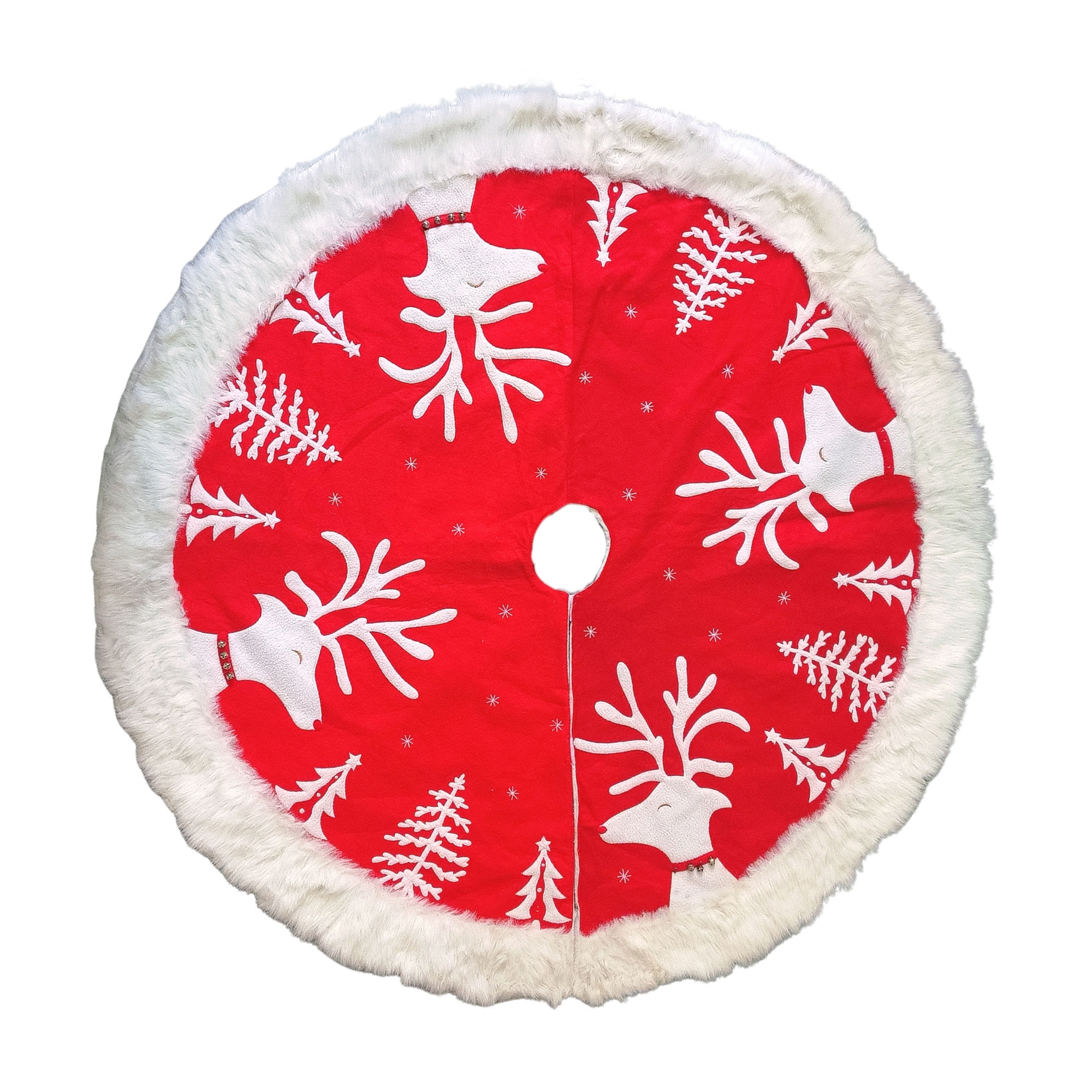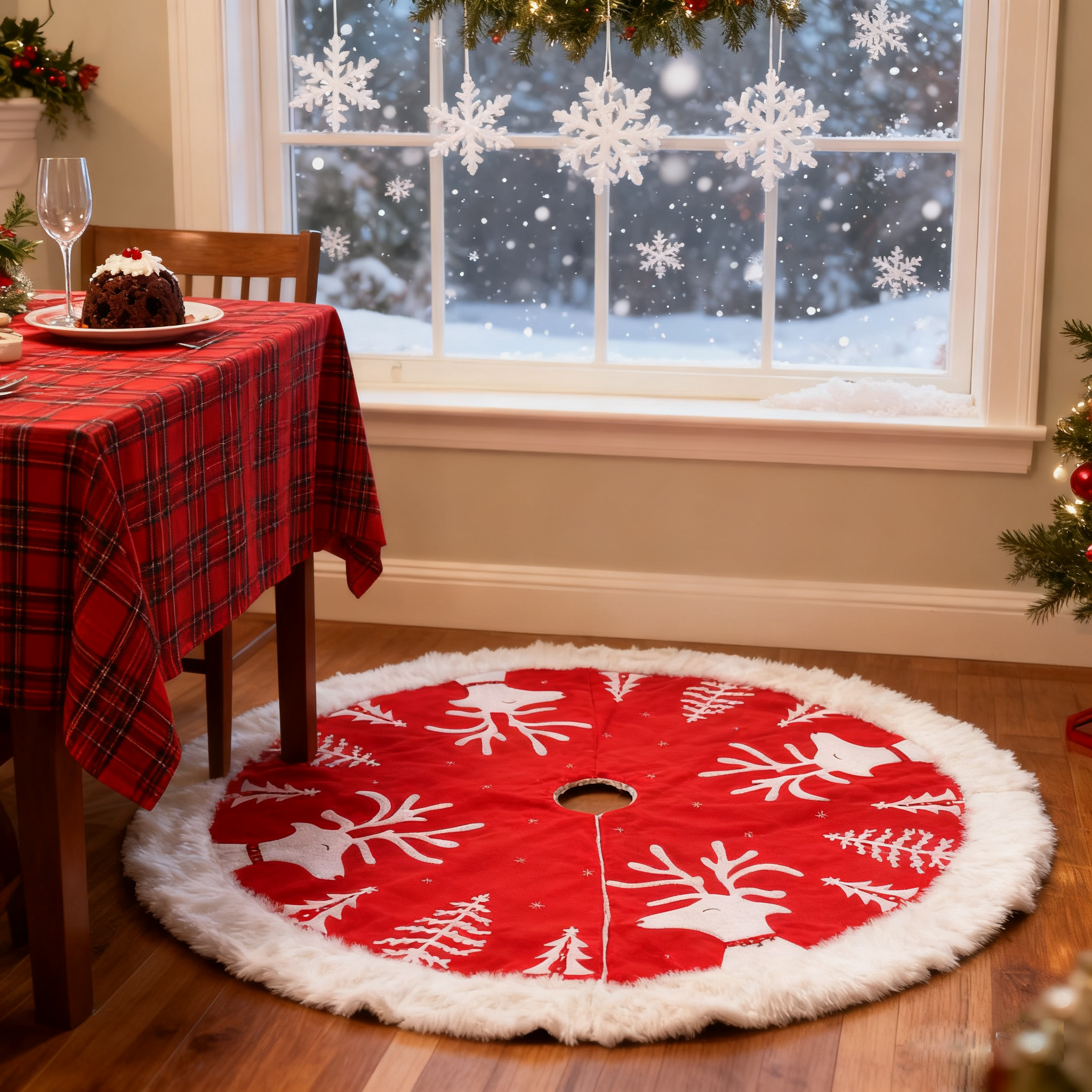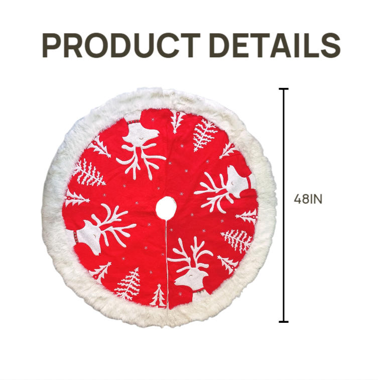 48 Inch Christmas Tree Skirt – Large Reindeer Red Xmas Tree Mat, Double Layer Soft Non-Woven with Rabbit Hair for Indoor Outdoor Winter Decorations & Party Decoration